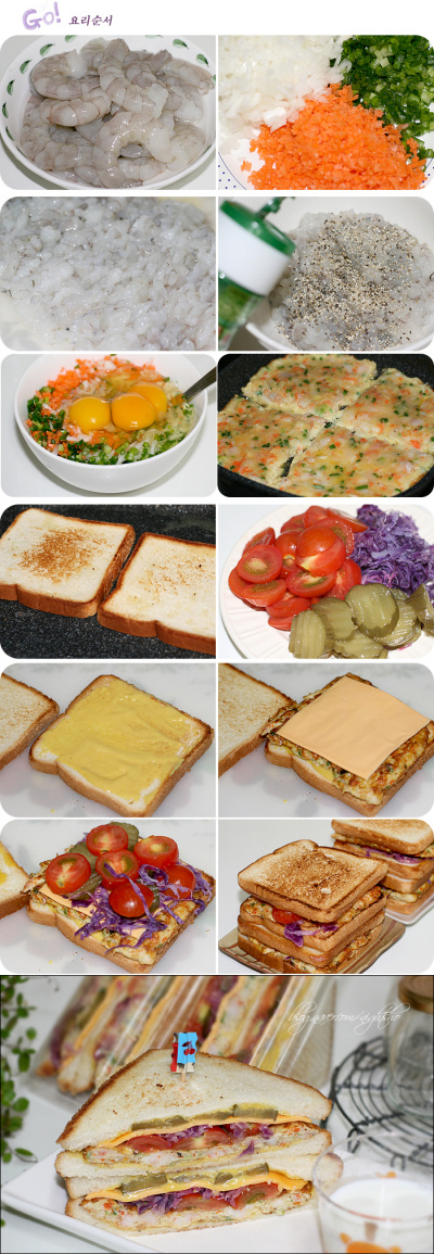 식빵 8장, 새우살한컵, 계란 3개, 실파 4줄기, 양파 반개, 당근 조금, 청주 5숟갈, 허브맛솔트 약간, 버터약간, 카놀라유2숟갈(식용유 대체 가능), 방울토마토 10개내외(토마토 가능), 적채, 오이피클적당양, 치즈 4장