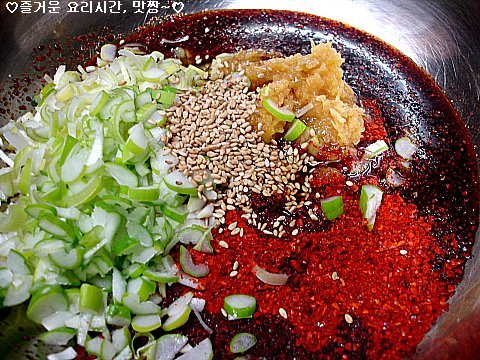 고추장3큰술, 고춧가루1큰술, 물엿1큰술, 설탕1큰술, 식초2큰술, 진간장1큰술, 다진마늘1큰술, 참기름1큰술, 통깨 |
