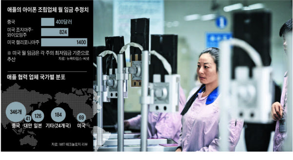 미국으로 공장을 옮길 경우 우선 비싼 임금이 문제로 지적된다. 미국의 IT 전문매체 시넷에 따르면 폭스콘 중국 공장 노동자들의 월평균 임금은 약 400달러(약 46만원)로 추정된다. 하지만 미국에선 주(州)별로 최저임금을 적용하더라도 최소 2배, 많게는 3배가 더 든다. 부품 공급 비용도 대폭 오른다. MIT 테크놀로지 리뷰에 따르면 올해 기준 애플의 협력업체는 28개국 766개 업체에 달한다. 중국(346개, 전체 45%), 일본(126개·16%)과 대만(41개·5%) 등 대부분이 아시아에 집중돼 있다. 미국 기업은 9%(69개)에 불과하다. 미국으로 공장을 옮기면 아시아 지역에서 만든 상당수 부품을 태평양 건너 미국까지 옮겨야 하는 것이다.
