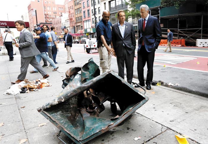 폭탄 터진 공구함 살펴보는 뉴욕시장·주지사 - 18일(현지 시각) 미국 뉴욕 맨해튼 남서부 첼시 지역에서 빌 더블라지오(맨 오른쪽) 뉴욕 시장과 앤드루 쿠오모(오른쪽에서 둘째) 뉴욕 주지사가 전날 밤 대형 폭발로 찌그러진 건설용 공구함을 살펴보고 있다. 이 공구함에서 터진 것으로 추정되는 폭탄으로 29명이 부상을 입었다. /AP 연합뉴스