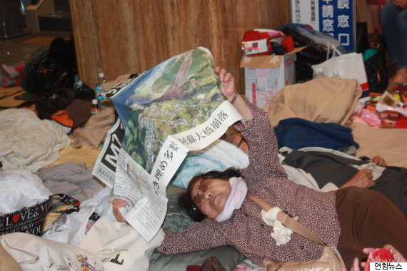 연쇄 강진이 강타한 일본 구마모토현 이재민이 호외 신문을 읽고 있다.