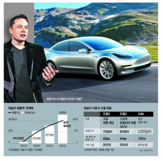 테슬라 창업주이자 회장인 머스크의 오랜 꿈은 합리적 가격에 주행거리가 긴 전기차로 양산차 시장에 진입하는 것이다. 지난주 공개한 모델3는 이런 그의 꿈을 실현할 ‘기대주’로 평가받는다. 전 세계 자동차 업계는 모델3의 흥행 성공에 내연기관 자동차 시대가 저물고 전기차 시대가 앞당겨지지 않을지 촉각을 곤두세우고 있다.