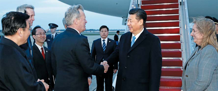 워싱턴 도착한 시진핑 - 30일(현지 시각) 시진핑 중국 국가주석이 워싱턴DC에 도착해 미 정부 관계자와 악수하고 있다. 시 주석은 31일 핵안보정상회의에 참석해 한·미·일 정상과 만났다. /신화 연합뉴스