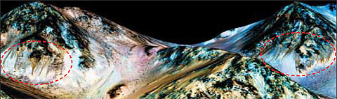 화성의 산등성이 경사면에서 수직으로 이어지는 좁고 어두운 실선들(붉은 점선 안)은 길이가 100m에 이른다. 화성에서 반사된 빛을 분석한 결과 이곳이 소금기를 띤 물이 흐르는 곳임을 밝혀냈다. /NASA 제공