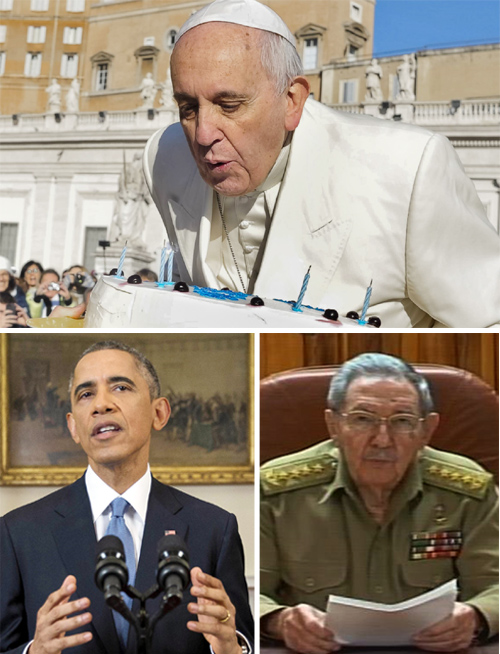 적대국 화해 주선한 교황 ‘역사적인 생일’ 자축 미국과 쿠바가 53년간의 적대 관계를 청산하기로 합의한 가운데 버락 오바마 미국 대통령(아래 왼쪽 사진)이 17일 기자회견을 열고 국교 정상화 선언을 하고 있다. 이번 국교 정상화에서 중재를 맡은 것으로 알려진 프란치스코 교황(위쪽 사진)은 이날 78번째 생일을 맞아 축하 케이크의 촛불을 끄고 있다. 같은 날 라울 카스트로 쿠바 국가평의회 의장(아래 오른쪽 사진)도 쿠바 인민들에게 국교 정상화를 알리고 있다. 워싱턴·바티칸=AP 뉴시스