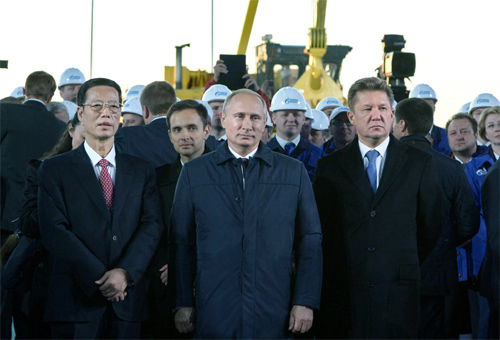 푸틴, 시베리아 가스관 기공식 참석 1일 시베리아 천연가스 파이프라인 기공식에 참석한 장가오리 중국 공산당 정치국 상무위원 겸 국무원 부총리, 블라디미르 푸틴 러시아 대통령, 알렉세이 밀러 러시아 국영 가스프롬 최고경영자(왼쪽부터). 야쿠츠크=AP 뉴시스