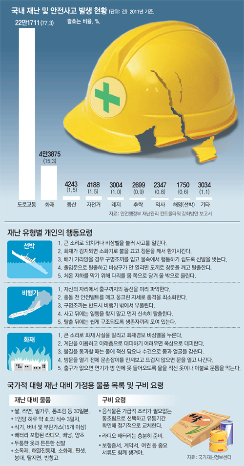 정부 매뉴얼은 풍수해, 지진, 해양오염, 항공기 사고, 지하철 사고 등 33개 사고 유형별로 나뉘어 있다. 얼핏 보면 사고 유형별로 세분해 구체적이고 전문적인 내용을 담고 있는 것 같지만 모든 매뉴얼이 한결같이 ‘최선을 다하자’는 다짐 수준에 그치고 있다. 해양수산부, 국토교통부, 환경부 등 재난과 직간접적으로 연관돼 있는 다른 부처들의 상황도 비슷하다.