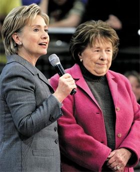 ▲ 상원의원이던 2007년 민주당 대선 후보 경선에 도전했던 힐러리 클린턴 국무장관이 당시 한 행사장에 어머니 도로시 로댐 여사(오른쪽)를 모시고 나와 지지자들에게 소개하고 있다. /AP 연합뉴스