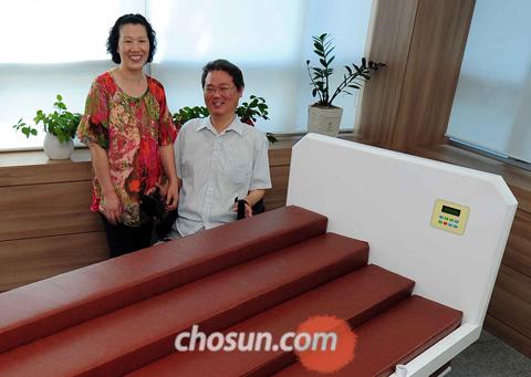 ▲ 장애인 발명가 최광훈씨가 자신이 개발한 장애인용 전동 침대 앞에서 부인 최순영씨와 함께 환하게 웃고 있다