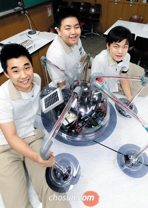 ▲ 상문고 세 학생(왼쪽부터 용환무·황휘·김도원군)은 오는 12월 호주에서 열리는 국제대회에 한국 대표로 참가한다.“ 이번 국제대회 주제가‘물에 관한 로봇’입니다. 대회장인 골드코스트(Gold Coast)에서 출전자들이 만든 로봇을 실제로 바닷물에 띄운대요. 파도를 감안해‘거미 로봇’을 좀 더 견고하게 만들고 부력도 더 키워볼 생각이에요.”