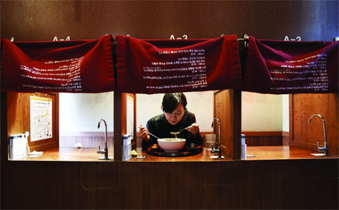 서울 마포구의 한 회사에 다니는 회사원 이정재(29)씨는 홀로 야근을 하게 되면 찾는 식당이 있다. 혼자 간단하게 먹을 수 있는 신촌의 라면집 ‘이찌멘’이다. 자판기에 메뉴를 입력하고 결제를 마치면 도서관 자리를 예약하듯 자리가 지정된다. 식권을 내서 주문한 음식이 나오면 독서실같이 칸막이가 있는 1인용 식탁에서 홀로 라면을 즐기면 된다. 이찌멘 신촌점 책임자 이명재씨는 “전체 23석 중 1인용 식탁은 11개로, 하루 250명 정도의 손님 중 절반가량인 110명 정도가 혼자 식사를 하고 간다”고 했다.