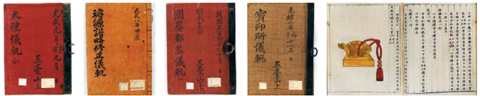 ▲ 일본 궁내청에 소장된 조선왕실의궤들. 왼쪽부터‘대례의궤’‘선원보략수정의궤’‘국장도감의궤’‘보인소의궤’표지. 맨 오른쪽 사진은 보인소의궤에 실린‘대조선국주상지보(大朝鮮國主上之寶)’그림이다. /조선왕실의궤환수위 제공