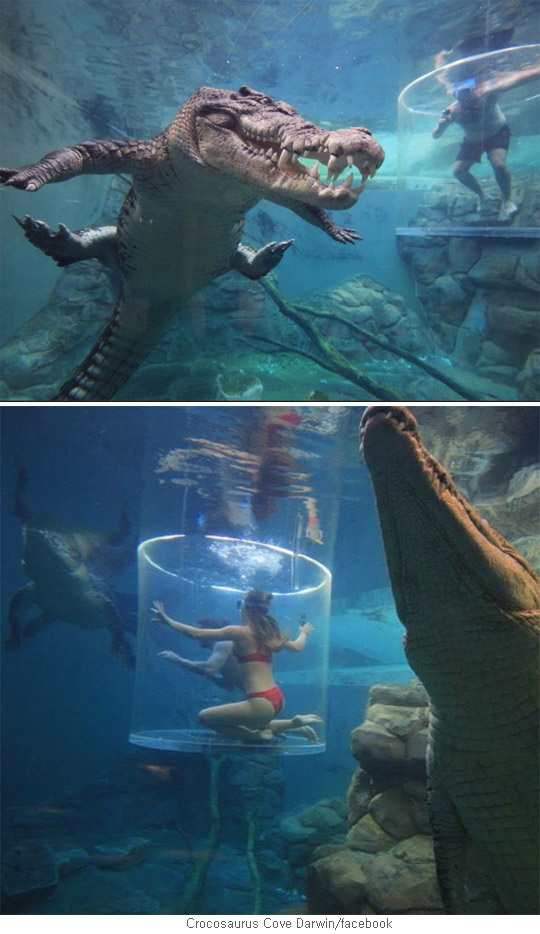 사람과 악어 사이에 존재하는 것은 오직 '투명한 판'뿐이다. 물 속에 설치된 투명한 얇은 유리 통에서 악어를 구경할 수 있는 것이다. 이 악어 쇼는 호주 ‘크로코사우러스 코브’에서 펼쳐지고 있다. 이 놀이공원에는 약 200마리의 악어가 살고 있다. 관람객들은 악어가 우글거리는 물 속으로 들어간다. 살아 움직이는 악어의 몸짓을 생생하게 느낄 수 있다.