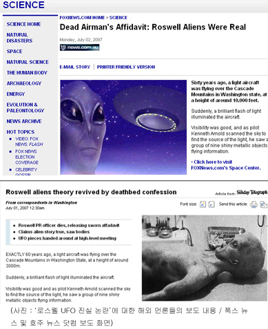 (사진 : ‘로스웰 UFO 진실 논란’에 대한 해외 언론들의 보도 내용 / 폭스 뉴스 및 호주 뉴스 닷컴 보도 화면)