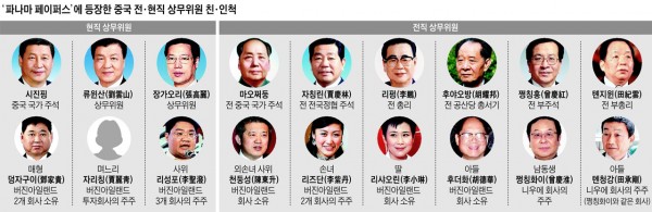 쩡칭훙(曾慶紅) 전 부주석의 남동생 쩡칭화이(曾慶淮)와 톈지윈(田紀雲) 전 부총리의 아들 톈청강(田承剛)은 같은 회사의 주주로 등재돼 있었다. 두 사람은 남태평양의 조세회피처인 니우에에 2006년 설립된 회사의 이사로 나란히 이름을 올렸다. 중국 건국의 아버지인 마오쩌둥의 손녀사위인 천둥성은 2011년 버진아일랜드에 회사를 설립한 것으로 밝혀졌다. 이번에 밝혀진 중국 지도층 친인척들의 역외기업 설립은 대부분 후진타오(胡錦濤) 전 주석 집권기(2004~2012년)에 이뤄진 것으로 파악됐다.