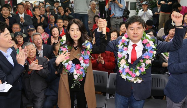 지상욱 새누리당 서울 중구 성동을 후보가 당선됐다. 그는 배우 심은하의 남편이다. 지상욱 후보의 선거운동 기간에는 모습을 드러내지 않았던 심은하가 남편의 당선과 함께 나타났다. 4월 14일 새벽, 서울 중구 신당동에 위치한 지상욱 후보의 선거 사무소에서 지지자들에게 인사를 하고 있다.