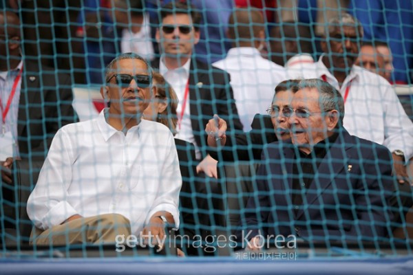 버락 오바마 미국 대통령과 라울 카스트로 쿠바국가평의회 의장이 23일(한국시간) 쿠바 아바나 라티노아메리카 경기장에서 열린 메이저리그 탬파베이 레이스와 쿠바국가대표팀간 친선경기를 관전했다.