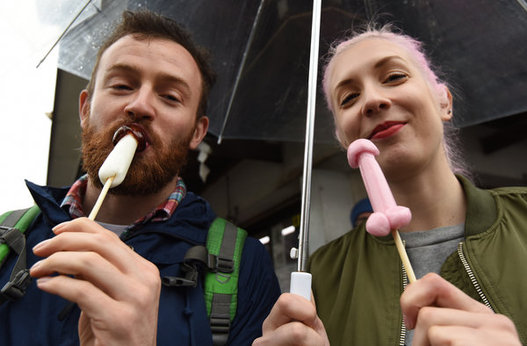 이날 축제가 벌어지는 장소에선 그야말로 눈에 보이는 모든 형태가 페니스다. 1m가 넘는 분홍색과 검은색 남근이 가마를 타고 거리를 행진하는 사이 구경꾼들은 페니스 모양의 롤리팝을 입에 물고 이를 지켜본다.
